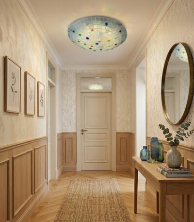 - Verre travaillé ou cathédrale : lumière filtrée et reflets colorés sur les murs. Le Plafonnier art déco rond avec verre travaillé crée des jeux de lumière sur les murs qui changent de teinte et d'intensité selon l'heure de la journée.