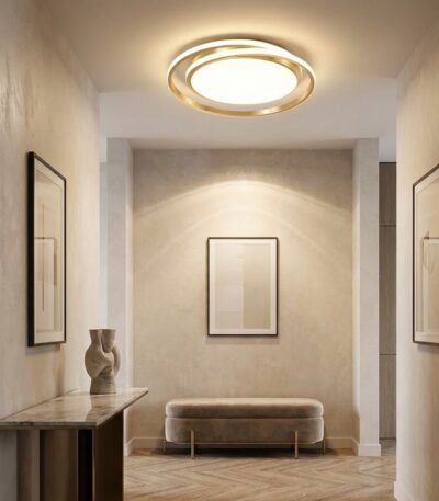 - Laiton ou doré : reflets chauds et élégance affirmée. Le Plafonnier art déco rond ou le Lustre plafonnier vintage s'intègrent dans un intérieur aux tons beiges, ivoire ou bordeaux et posent une atmosphère raffinée avec des reflets dorés qui réchauffent les murs dès qu'on allume le luminaire.