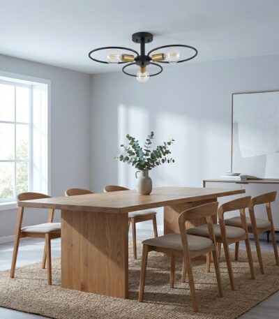 S'inspirer des dernières tendances déco, c'est miser sur le laiton doré sur fond blanc, les formes angulaires, triangulaires ou asymétriques pour sortir du rond classique, et le cristal pour un effet lumineux raffiné, qui capte la lumière sans dominer l'espace. Le plafonnier LED salon devient une pièce décorative à part entière, pas seulement une source de lumière. Les finitions noires s'accordent naturellement avec les intérieurs contemporains aux lignes épurées.