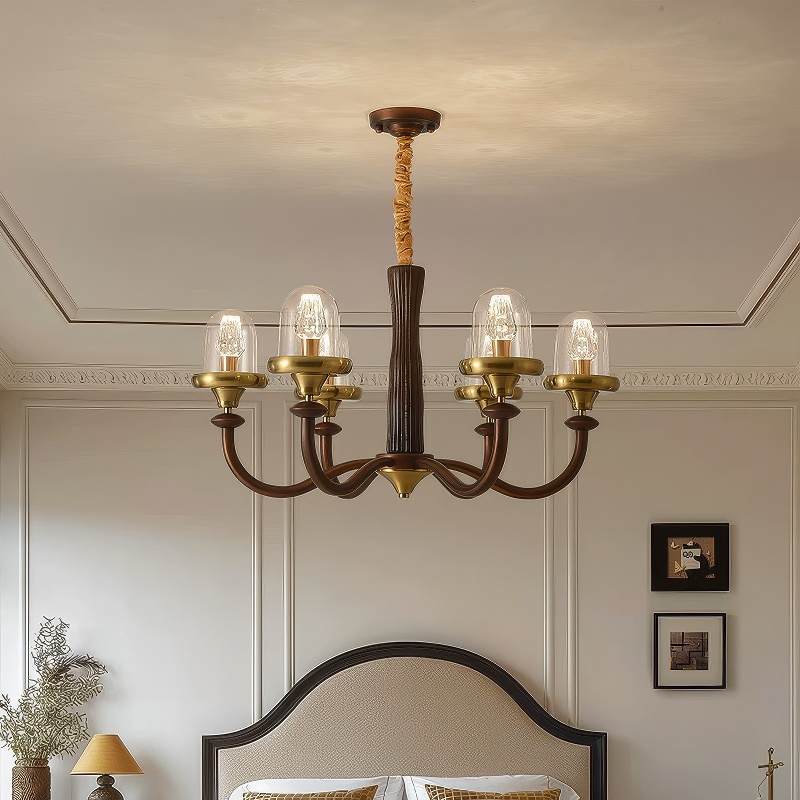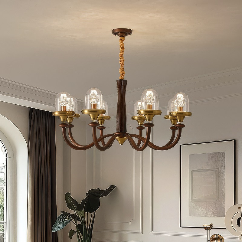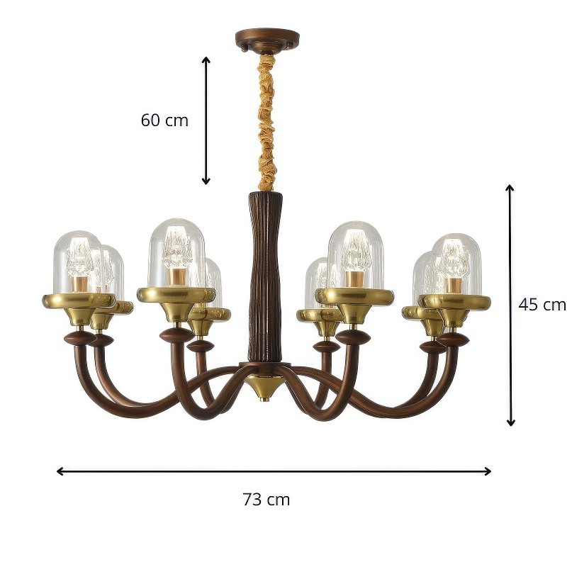 Cette majestueuse suspension art déco en bois incarne le raffinement des années 1920 avec ses lignes courbes parfaitement orchestrées et ses finitions dorées qui captent la lumière comme un bijou précieux. Le mariage harmonieux entre le bois noble teinté et les accents cuivrés crée une symphonie chromatique qui réchauffe instantanément votre intérieur. Ses six bras gracieusement sculptés déploient un éclairage généreux et théâtral, parfait pour sublimer une grande salle à manger ou créer une ambiance feutrée dans un salon bourgeois. Chaque détail révèle le savoir-faire artisanal d’époque : cannelures délicates, proportions équilibrées et patine authentique qui témoigne de son histoire. Cette pièce d’exception transforme votre plafond en galerie d’art et confère à votre espace cette sophistication vintage si recherchée. Véritable investissement décoratif, elle traverse les modes tout en apportant ce cachet unique que seules les pièces d’époque savent offrir.