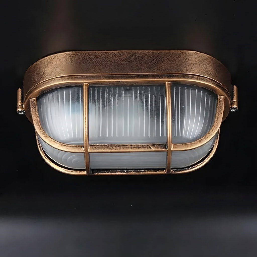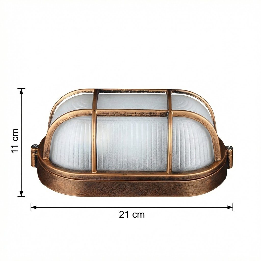 Ce luminaire ovale à grille métallique évoque les grandes heures des ateliers d’antan et des bâtisses maritimes. Sa finition cuivre brossé, son verre strié et sa structure robuste en font une pièce de caractère qui s’assume pleinement, aussi bien sur le patio que sous une terrasse couverte. Compatible ampoule LED, il se pare facilement d’une lumière chaude et vintage pour une atmosphère unique. Solide, intemporel et simple à poser, il transforme chaque espace ordinaire en un lieu chargé d’histoire.