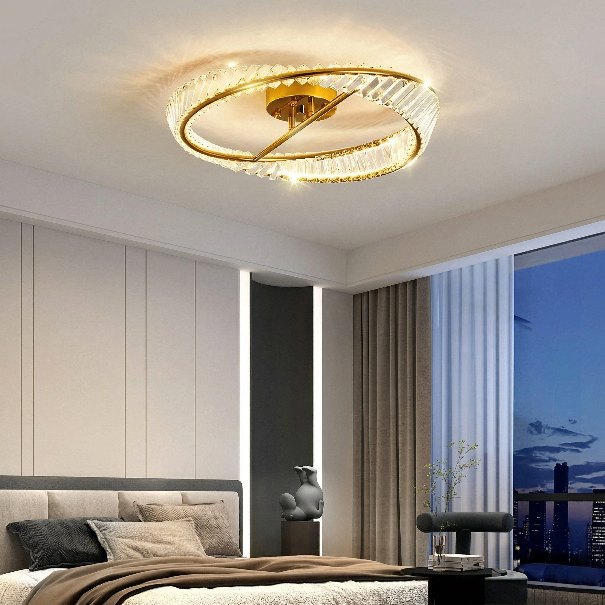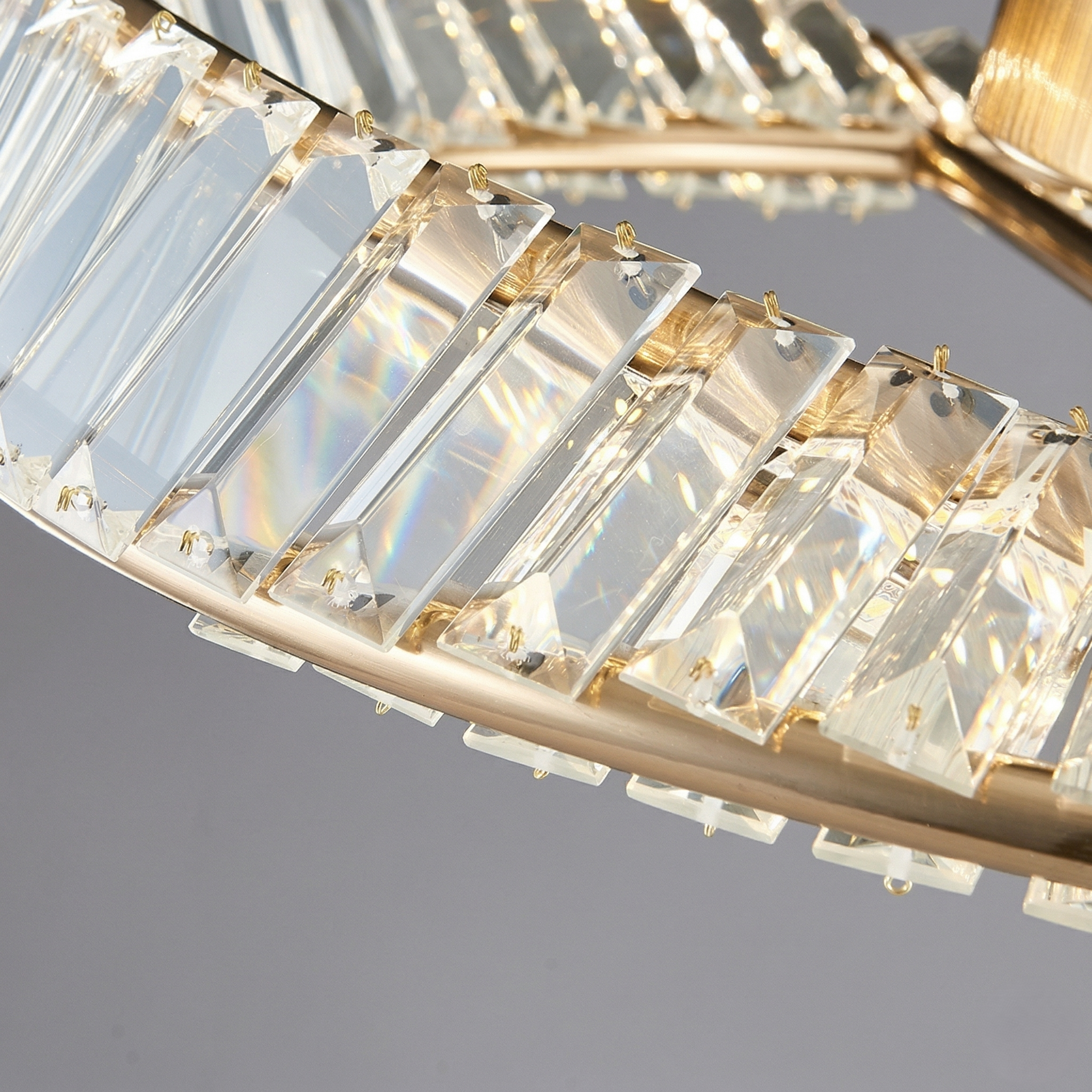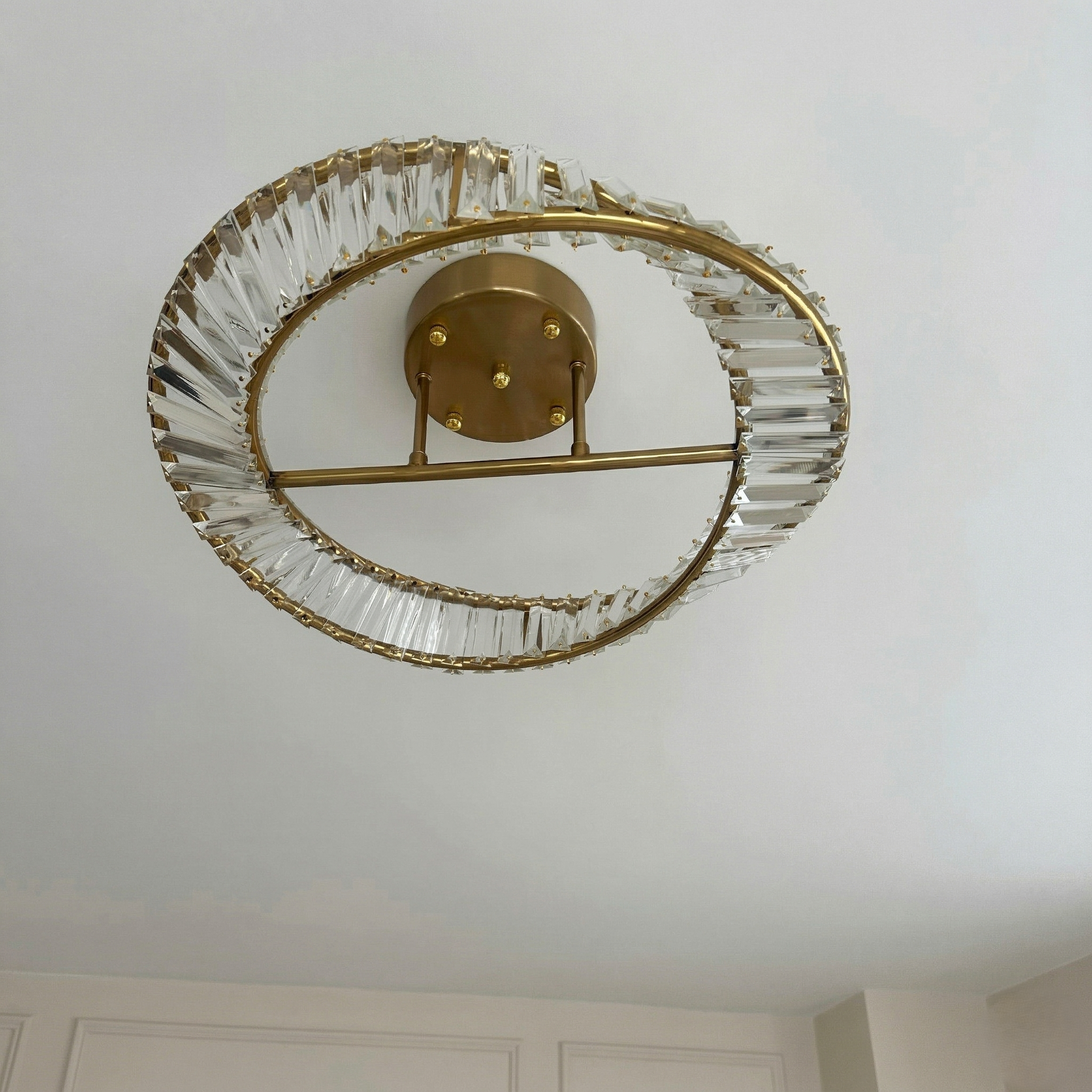 Optez pour ce grand plafonnier pour rehausser la décoration de votre intérieur. Son anneau de cristal taillé enchâssé dans un cercle d’acier doré projette mille reflets lumineux, transformant instantanément n’importe quelle pièce en espace raffiné. La lumière se faufile à travers chaque facette de cristal pour créer un halo doux et enveloppant, digne des plus beaux intérieurs. Sobre et majestueux à la fois, il s’impose aussi bien dans un salon contemporain que dans une entrée hôtelière. Les LED intégrées tricolores vous offrent une ambiance sur mesure, sans frais d’ampoules supplémentaires ni consommation excessive. Une installation simple, un résultat somptueux.