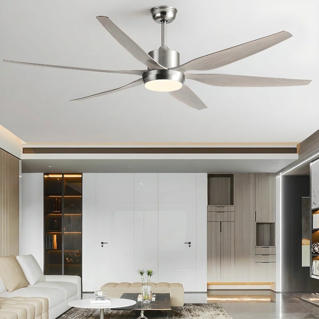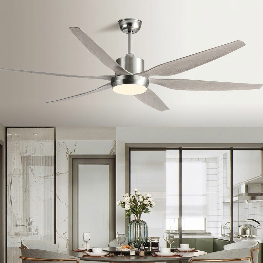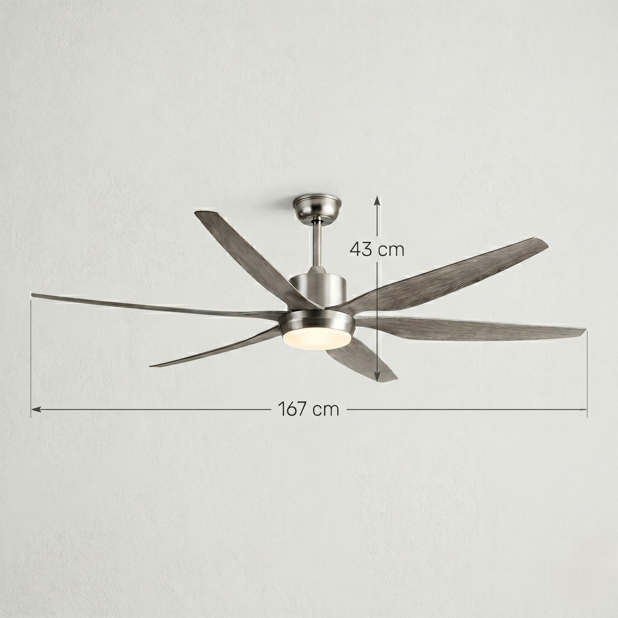 Avec ses 167 cm d’envergure et ses six pales aux reflets bois naturel, ce grand ventilateur plafonnier s’impose comme une pièce maîtresse de votre décoration. Sa finition nickel satiné dialogue parfaitement avec les intérieurs scandinaves, modernes ou minimalistes, apportant une présence aérienne et raffinée au-dessus de votre salon ou salle à manger. Compatible LED, il s’adapte à votre quotidien sans contrainte. Conçu pour les grandes pièces, il brassera l’air avec puissance et discrétion, transformant chaque saison en confort absolu.