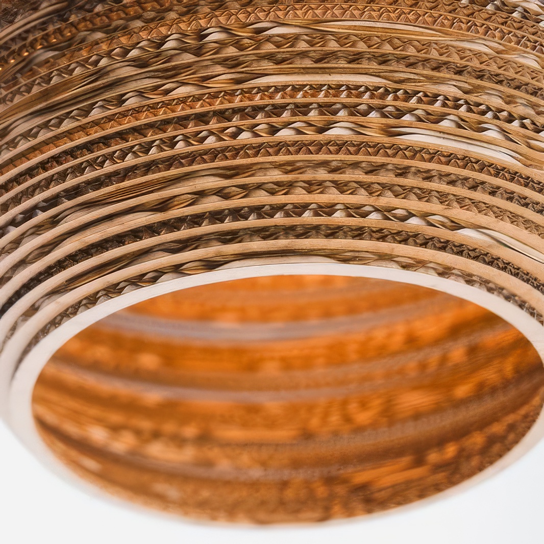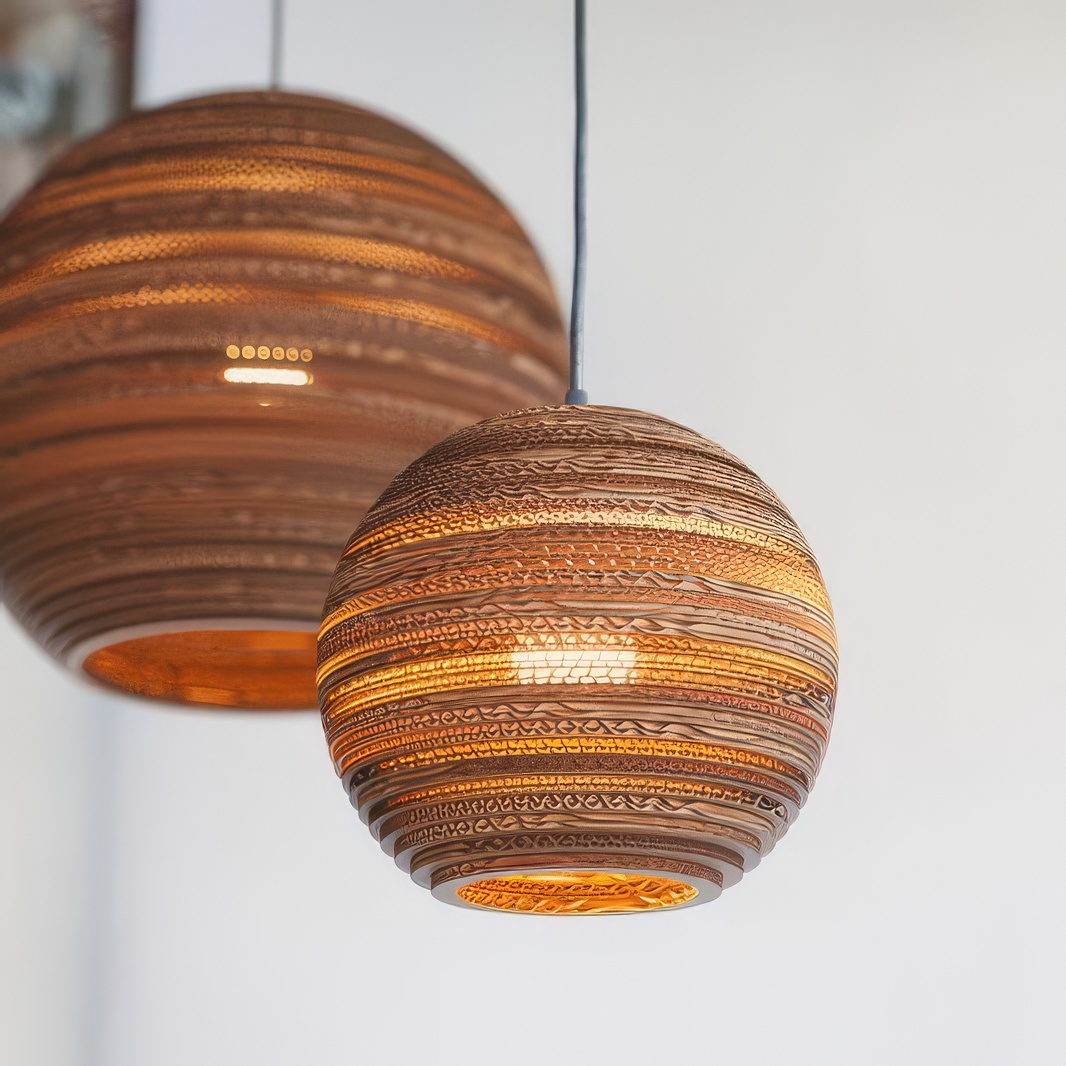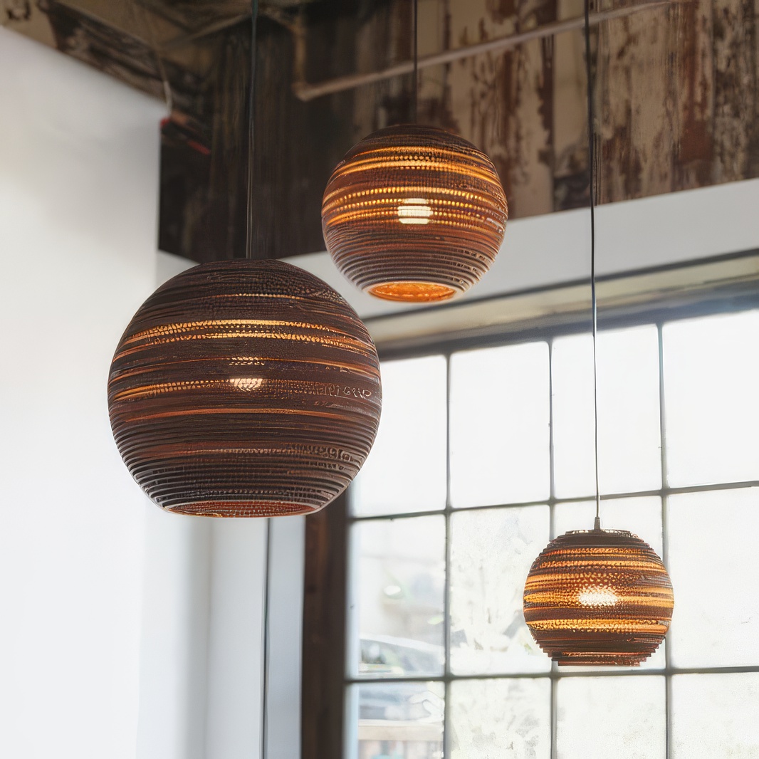 Boule suspension papier sombre, une sphère luminaire en papier ondulé pour une ambiance lumière zen et chaleureuse dans votre intérieur