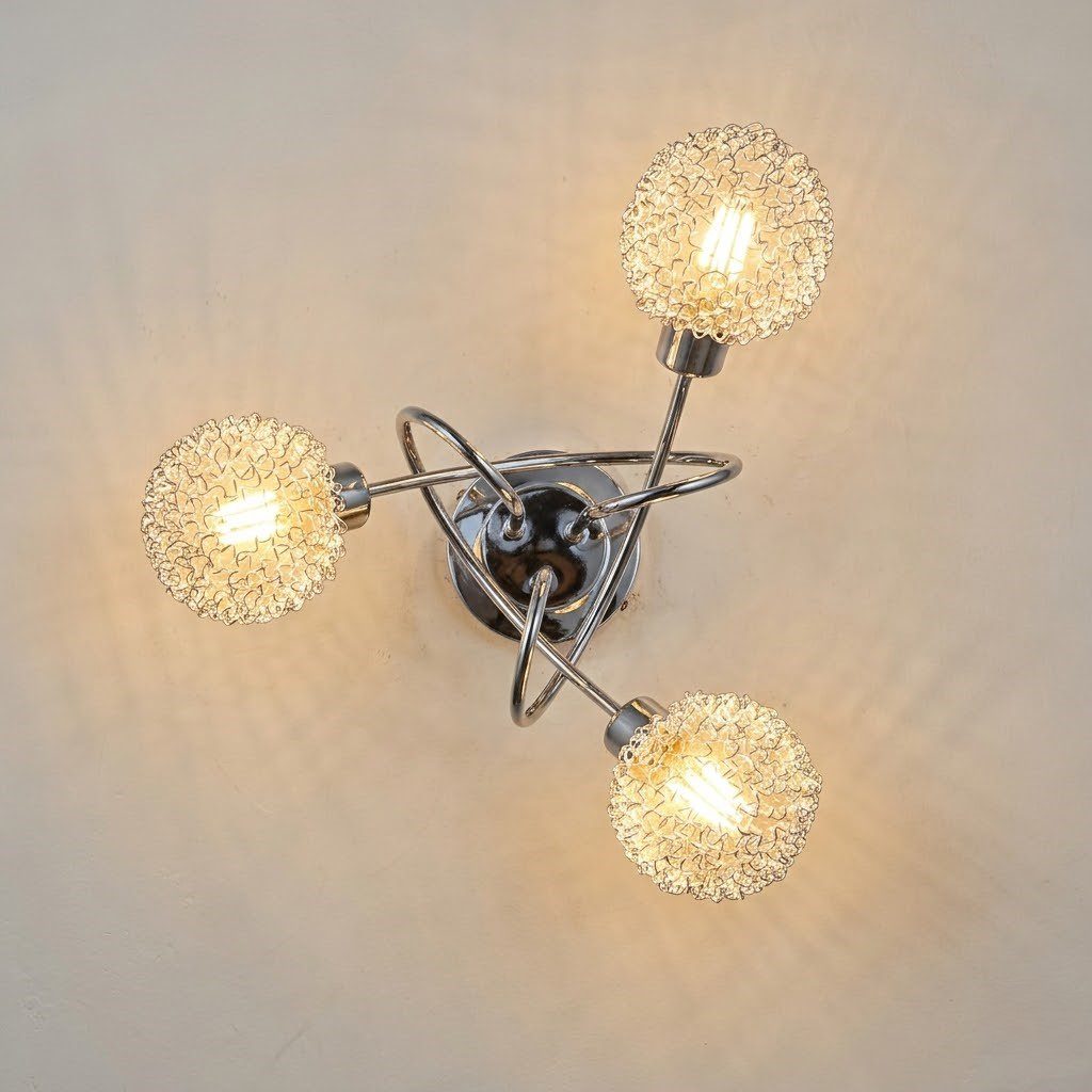 Ses bras en métal chromé s’entrelacent avec fluidité, comme une sculpture suspendue au plafond. Les trois abat-jours en verre texturé diffusent une lumière douce et scintillante, enveloppant la pièce d’une atmosphère raffinée et apaisante. Ce plafonnier incarne l’élégance moderne dans toute sa subtilité : discret dans ses dimensions, mais visuellement saisissant. Compatible avec les ampoules LED pour un éclairage économique, il s’installe simplement et s’intègre aussi bien dans une chambre que dans un salon contemporain.