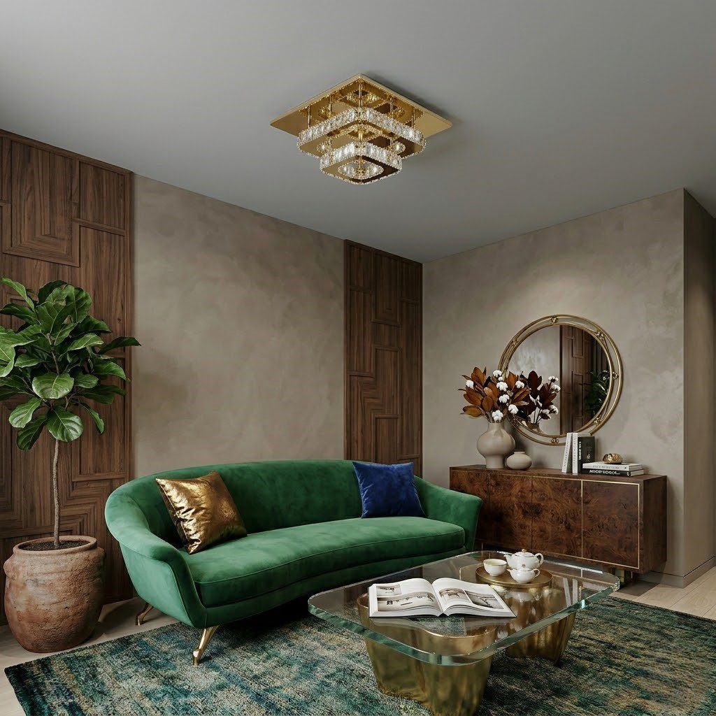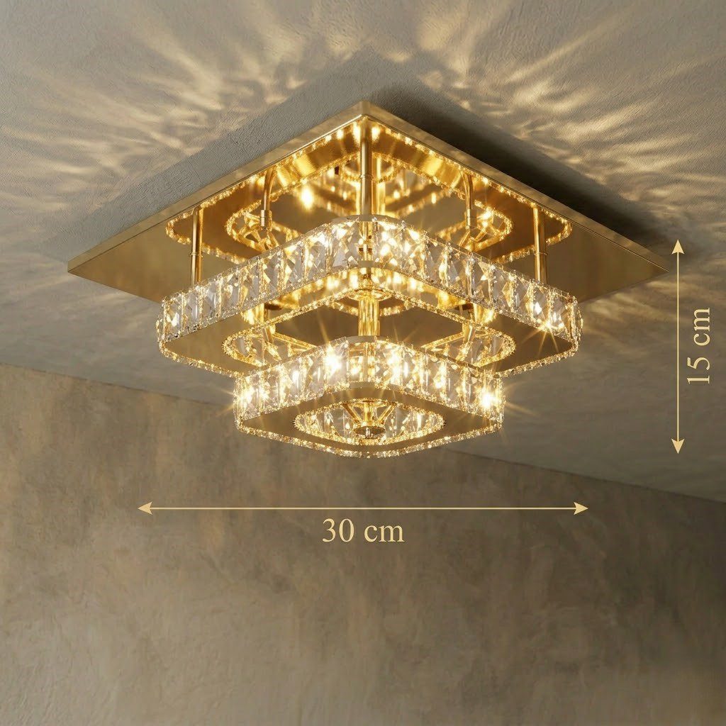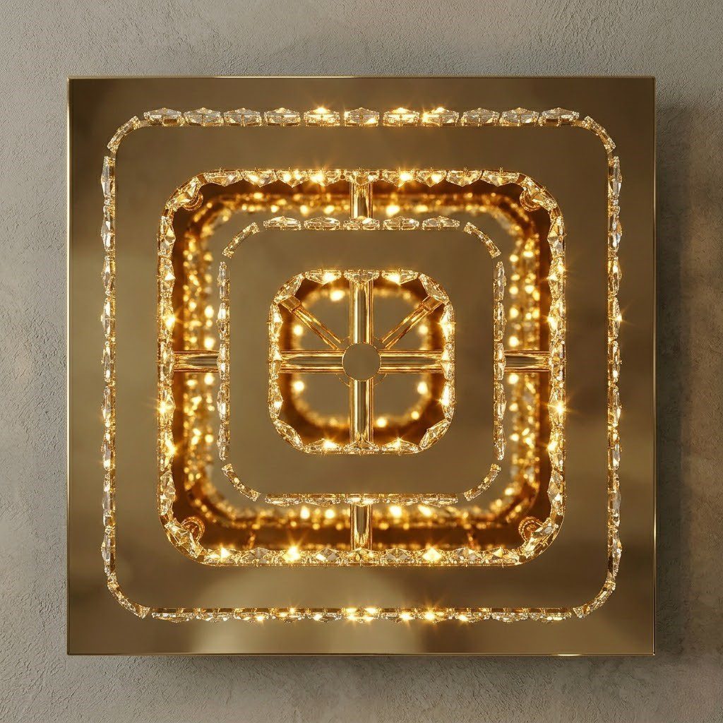 Sa structure carrée en acier inoxydable doré, ornée de cristaux taillés, capte et réfracte la lumière avec une précision qui fait scintiller les murs autour de lui. Un premier regard suffit : ce plafonnier incarne l’élégance art déco dans ce qu’elle a de plus raffiné. Parfait pour habiller une entrée, un couloir ou un salon, il transforme les espaces dès l’installation. Équipé d’un système LED intégré, il offre une lumière chaude, économique et sans remplacement d’ampoule à prévoir.