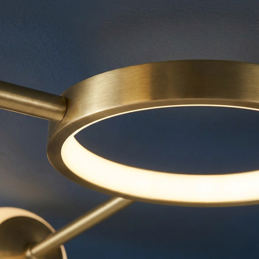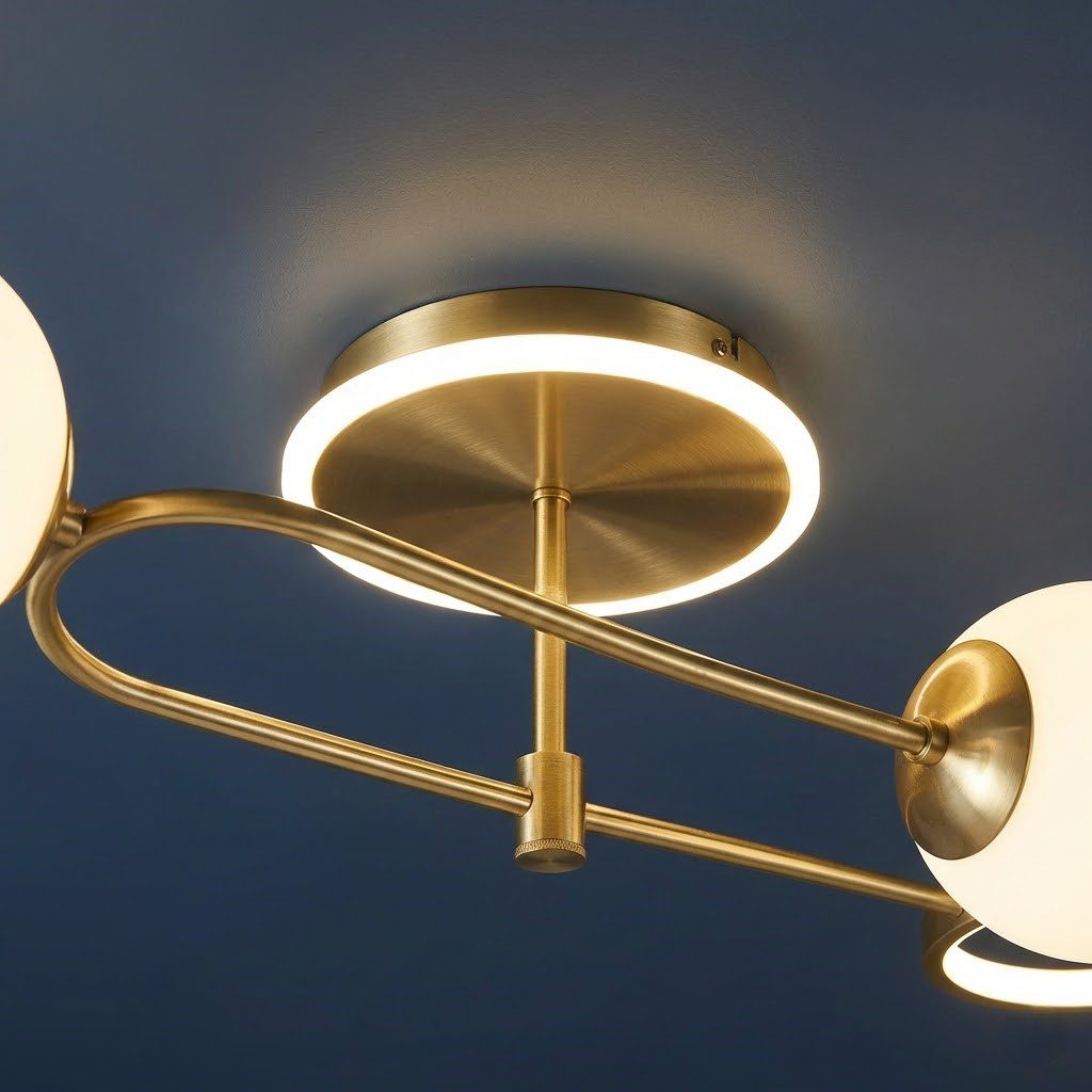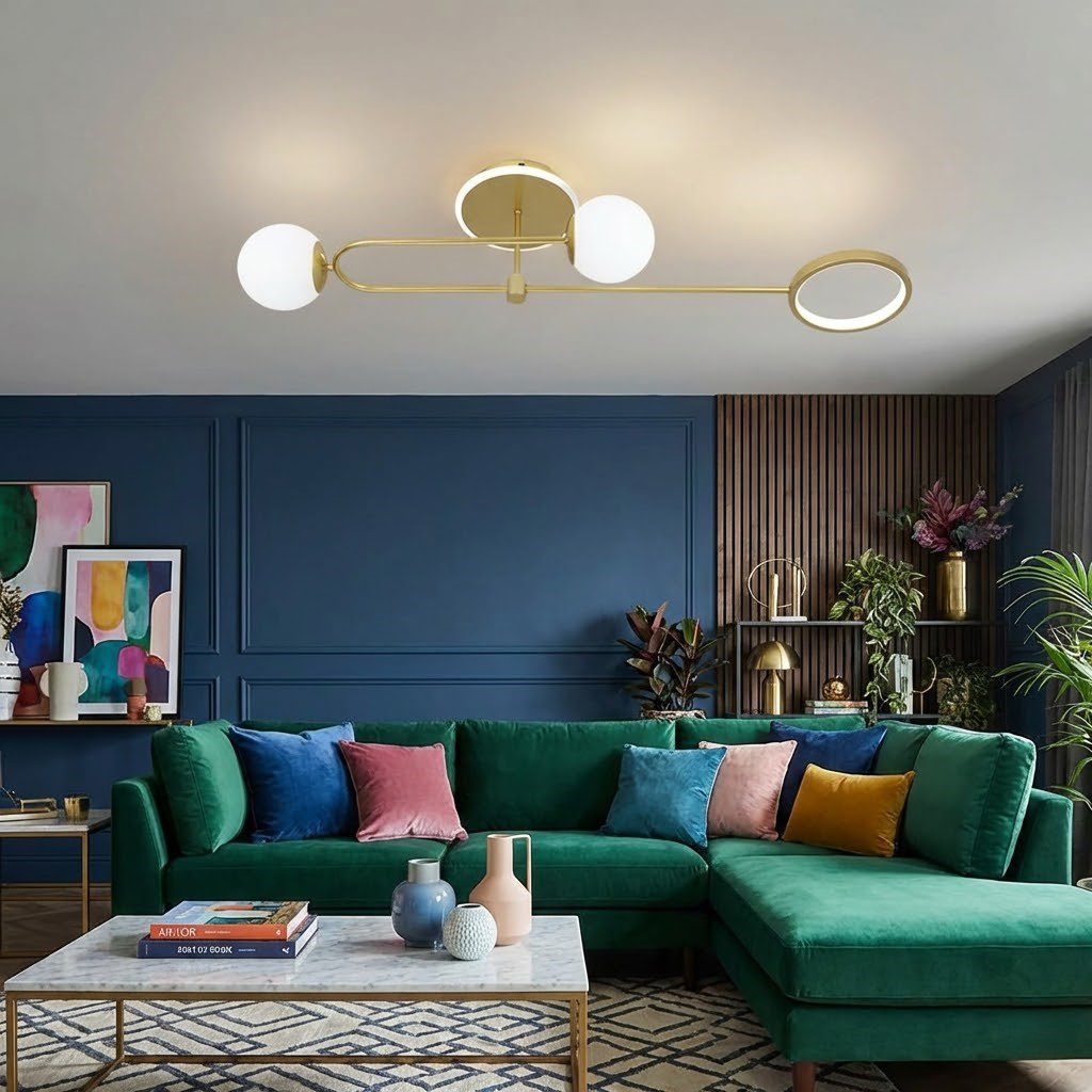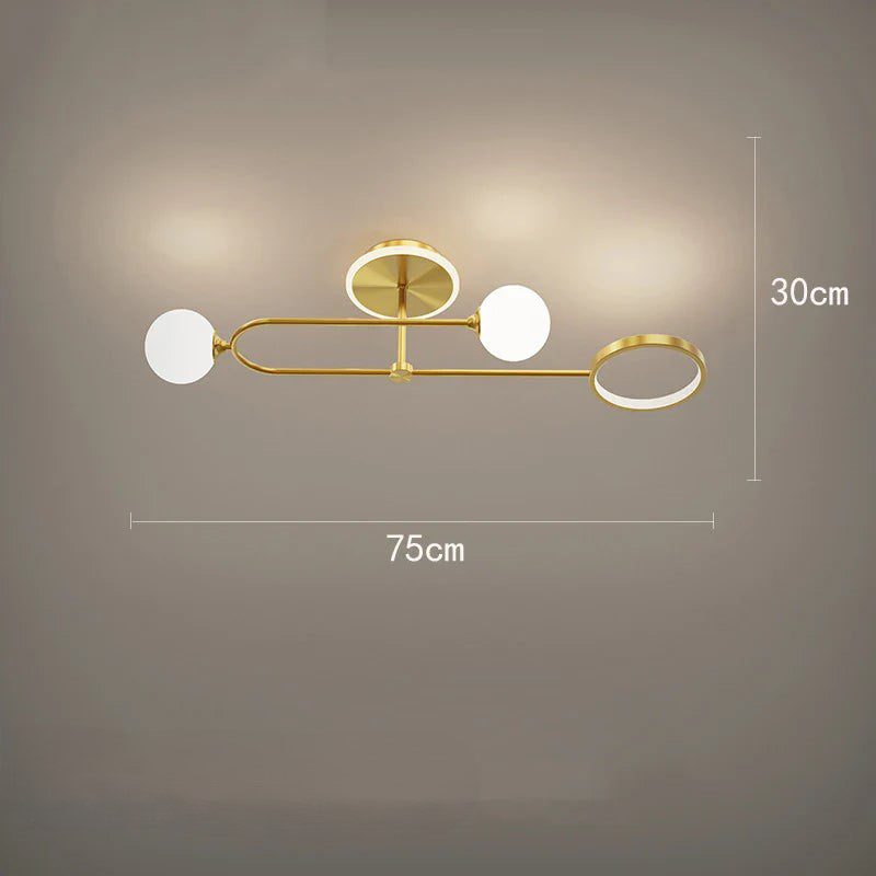 Ce plafonnier doré incarne l’équilibre parfait entre modernisme et raffinement Art déco. Ses lignes épurées dessinent une composition aérienne où les sphères de verre opalin dialoguent avec les anneaux dorés, créant un jeu graphique captivant. Sa finition dorée apporte une touche précieuse qui sublime instantanément votre intérieur, qu’il habille une salle à manger, un salon ou une chambre. Compatible avec des ampoules LED, il vous permet de maîtriser votre consommation énergétique tout en bénéficiant d’un éclairage optimal. Son installation simple au plafond et sa largeur imposante lui confèrent une présence affirmée sans encombrer l’espace. Un luminaire qui transforme chaque pièce en véritable galerie d’art contemporain.