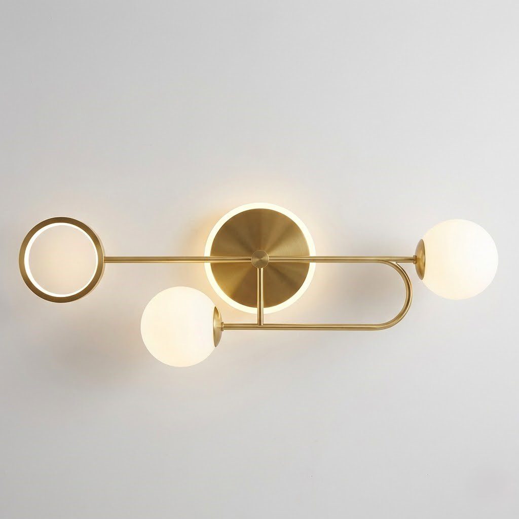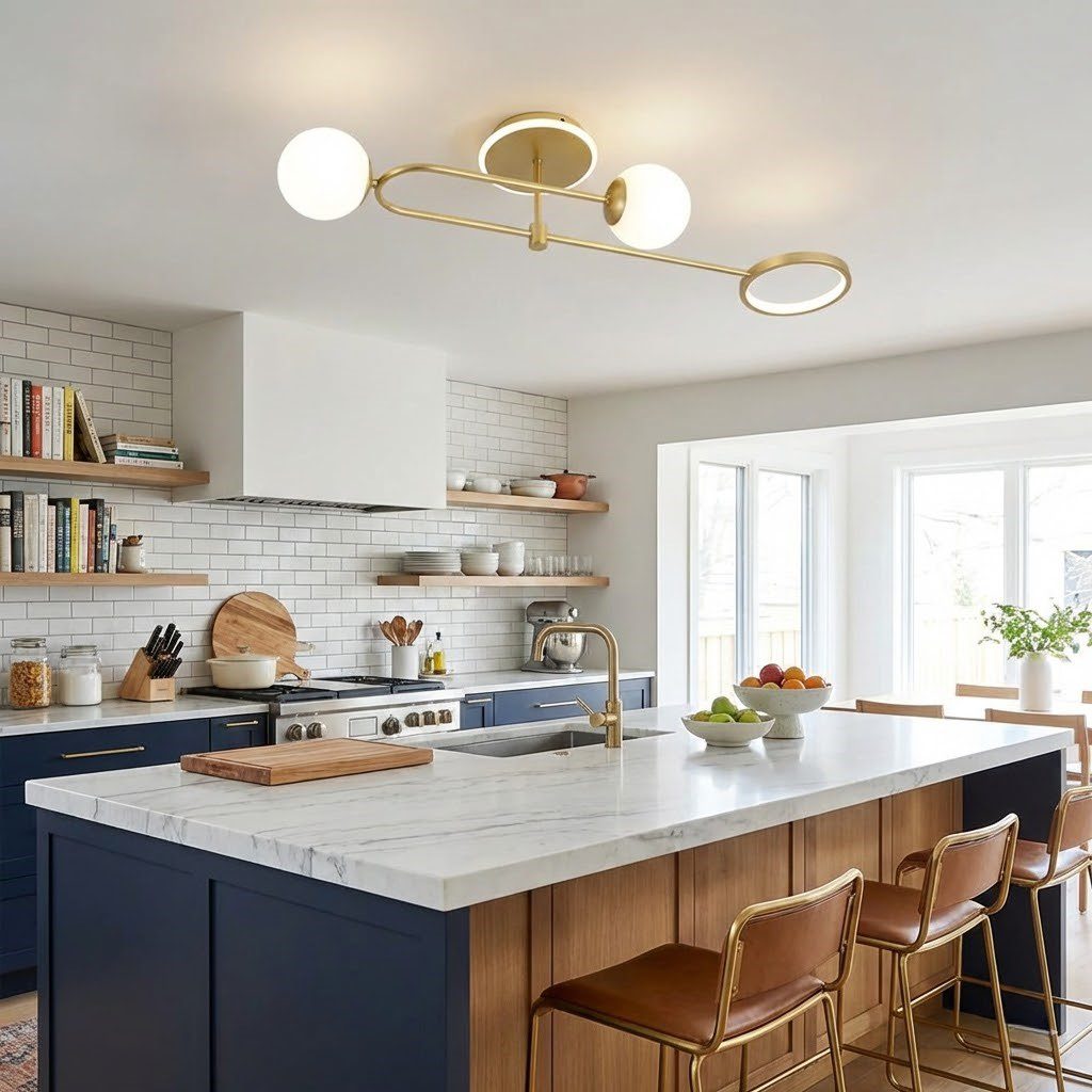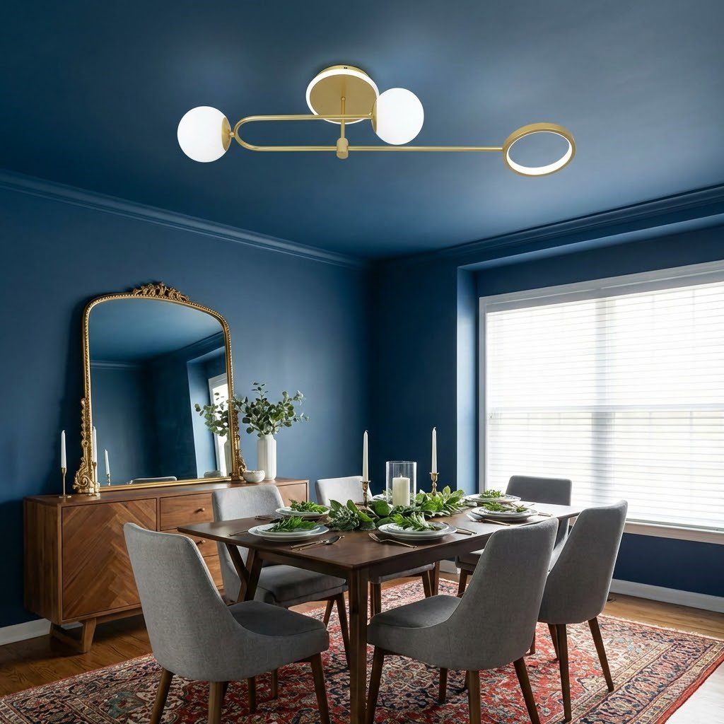 Ce plafonnier doré incarne l’équilibre parfait entre modernisme et raffinement Art déco. Ses lignes épurées dessinent une composition aérienne où les sphères de verre opalin dialoguent avec les anneaux dorés, créant un jeu graphique captivant. Sa finition dorée apporte une touche précieuse qui sublime instantanément votre intérieur, qu’il habille une salle à manger, un salon ou une chambre. Compatible avec des ampoules LED, il vous permet de maîtriser votre consommation énergétique tout en bénéficiant d’un éclairage optimal. Son installation simple au plafond et sa largeur imposante lui confèrent une présence affirmée sans encombrer l’espace. Un luminaire qui transforme chaque pièce en véritable galerie d’art contemporain.