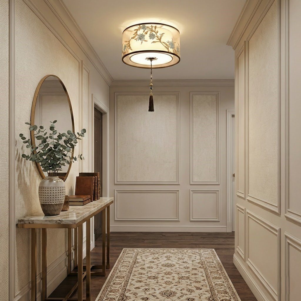 Ce plafonnier en tissu fleuri vous transporte dans un univers empreint de délicatesse et de sérénité. Inspiré de l’esthétique japonaise, il révèle des motifs floraux brodés qui filtrent la lumière avec une douceur envoûtante. Chaque détail, du pendentif ornemental aux branches fleuries peintes, raconte une histoire d’élégance intemporelle. Dans un salon ou une chambre, ce luminaire crée une ambiance apaisante, parfaite pour vos moments de détente. Compatible avec des ampoules LED économiques, il s’installe simplement au plafond. Ce plafonnier transforme votre pièce en un havre de paix où l’art oriental rencontre la fonctionnalité moderne.