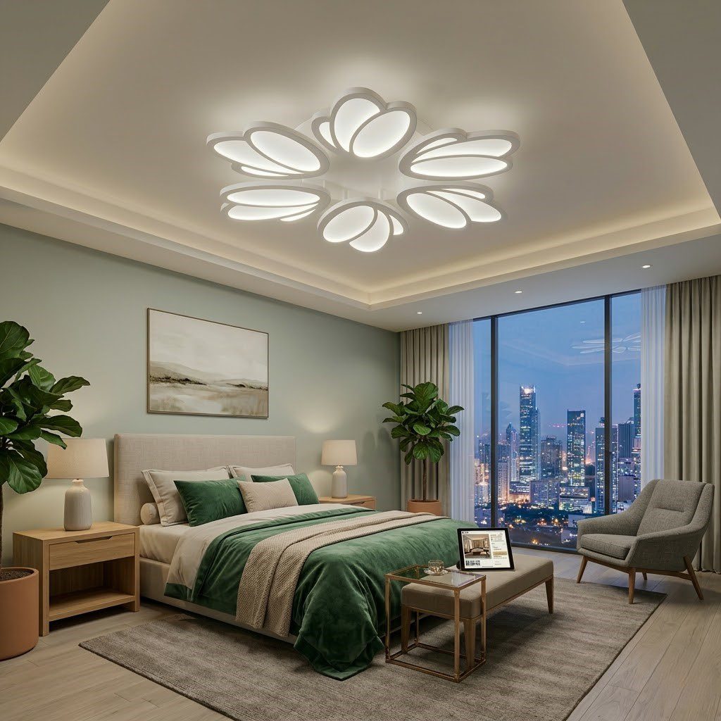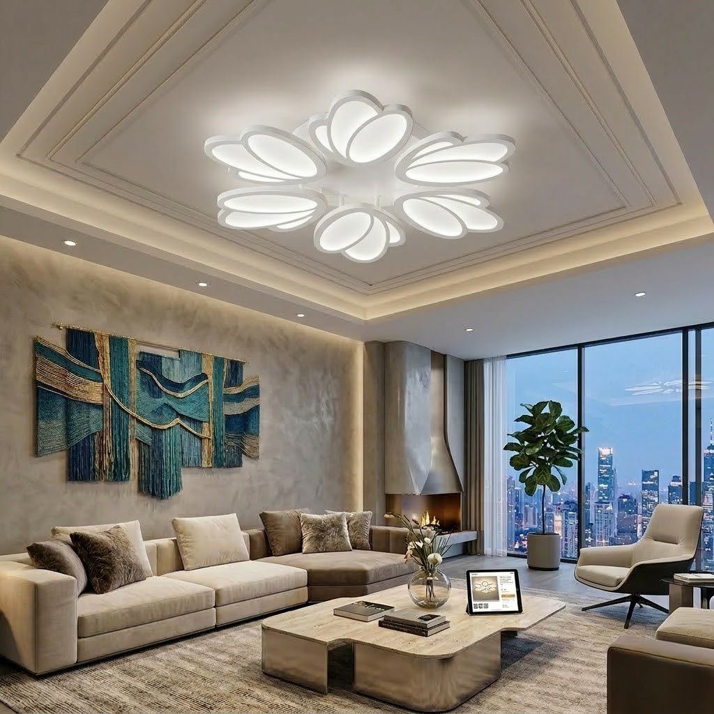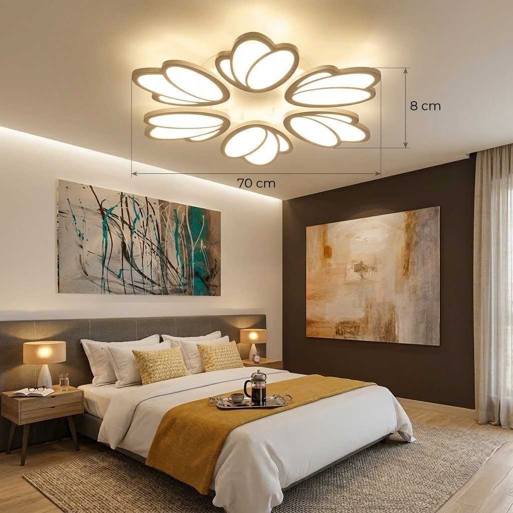 Six pétales de lumière s’assemblent en une composition florale majestueuse de 70 cm, mêlant structure en métal et diffuseurs acryliques pour un rendu à la fois moderne et chaleureux. Éteint, il habille le plafond comme une sculpture. Allumé, il baigne la pièce d’une lumière généreuse et réglable grâce à sa technologie LED à trois couleurs et sa gradation progressive. Parfait pour un salon, une chambre ou une salle à manger aux accents modernes ou art déco, il s’installe directement au plafond, sans contrainte.