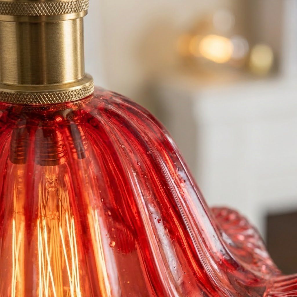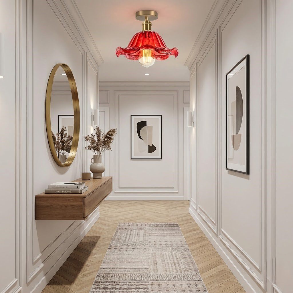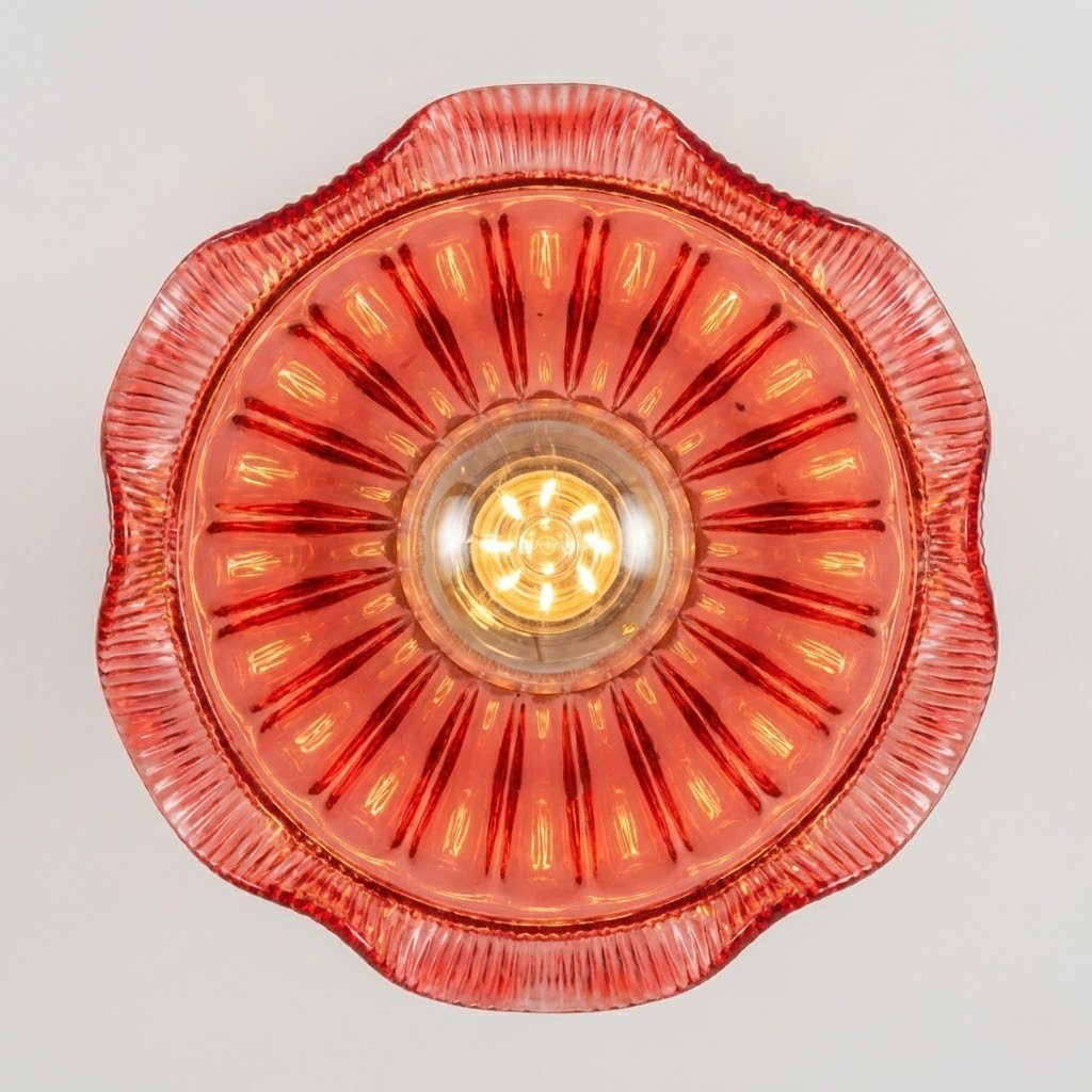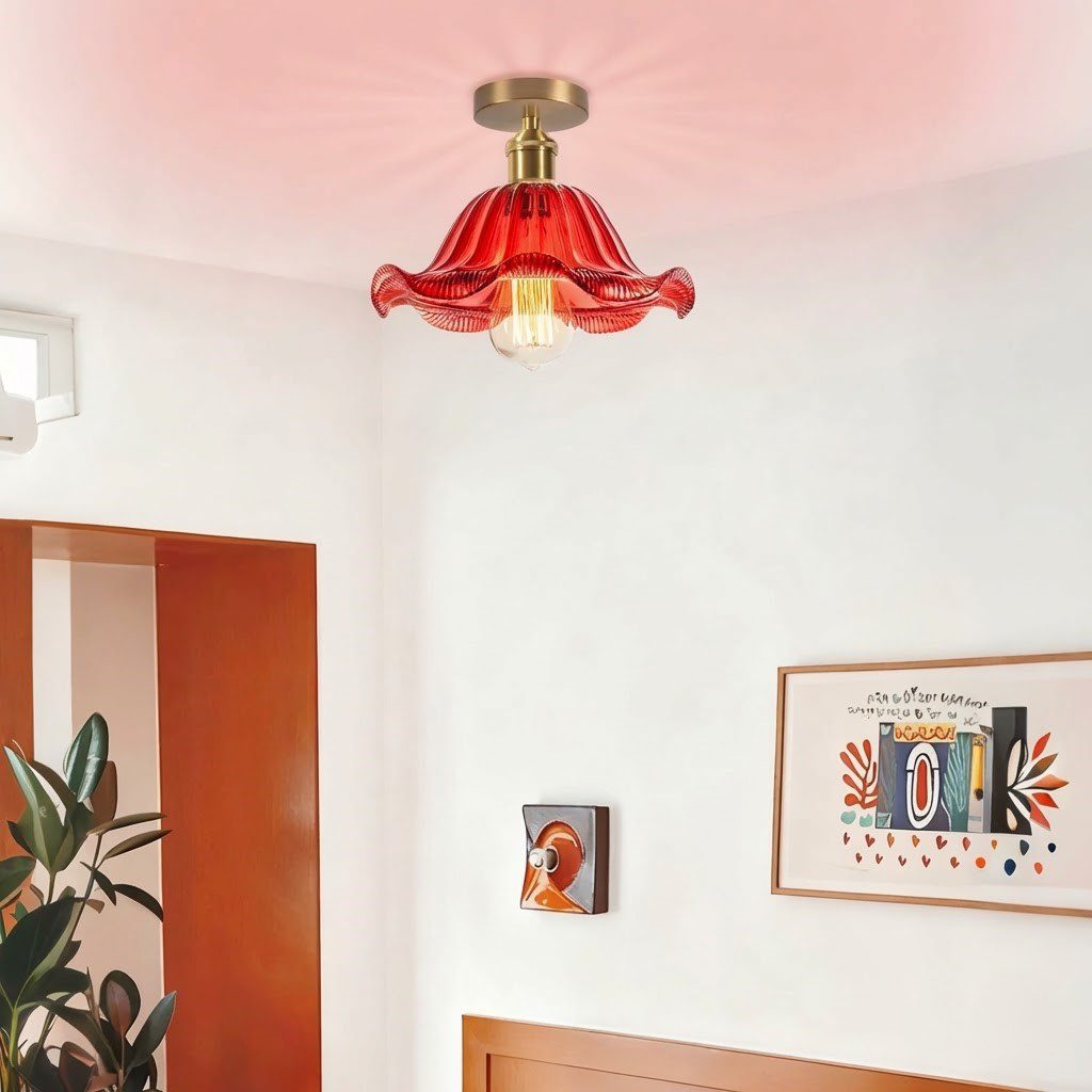 Tel un bouquet figé dans le verre, ce plafonnier en forme de fleur épanouie s’impose comme une véritable Å“uvre d’art suspendue au plafond. Son abat-jour en verre rouge texturé, aux contours ondulés et sensuels, capture et diffuse la lumière de façon envoûtante, projetant des reflets chauds et poétiques autour de vous. La monture dorée brossée apporte une élégance vintage qui sublime aussi bien un intérieur bohème qu’un décor plus classique. Facile à poser directement au plafond, ce luminaire compact s’installe sans contrainte et transforme instantanément n’importe quelle pièce en un espace chargé de caractère.