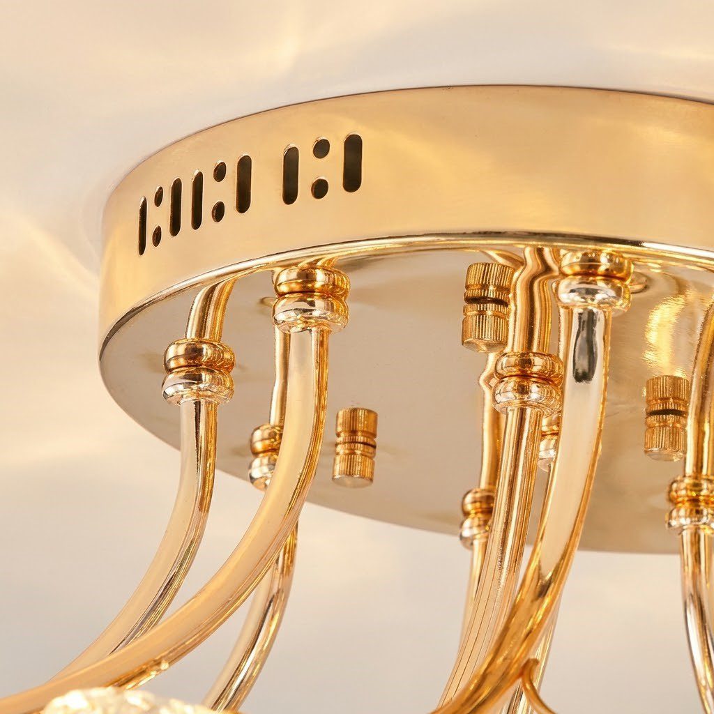 Ce plafonnier forme fleur luxe transforme votre plafond en véritable œuvre d’art. Tel un bouquet de cristal suspendu, ses douze globes en verre sculptés s’épanouissent sur des branches dorées élégantes, créant un spectacle lumineux captivant. Chaque pétale de lumière diffuse une clarté chaleureuse qui enveloppe votre salle à manger ou votre salon d’une ambiance raffinée et accueillante. L’or plaqué des finitions ajoute une touche de prestige qui attire naturellement le regard et sublime votre décoration. Avec ses 80 cm de diamètre, ce luminaire affirme son caractère art déco moderne tout en restant harmonieux. Livré complet avec ses ampoules, il s’installe facilement pour vous offrir immédiatement cette atmosphère luxueuse dont vous rêvez. Un éclairage généreux qui marie beauté et fonctionnalité pour magnifier vos moments de vie.