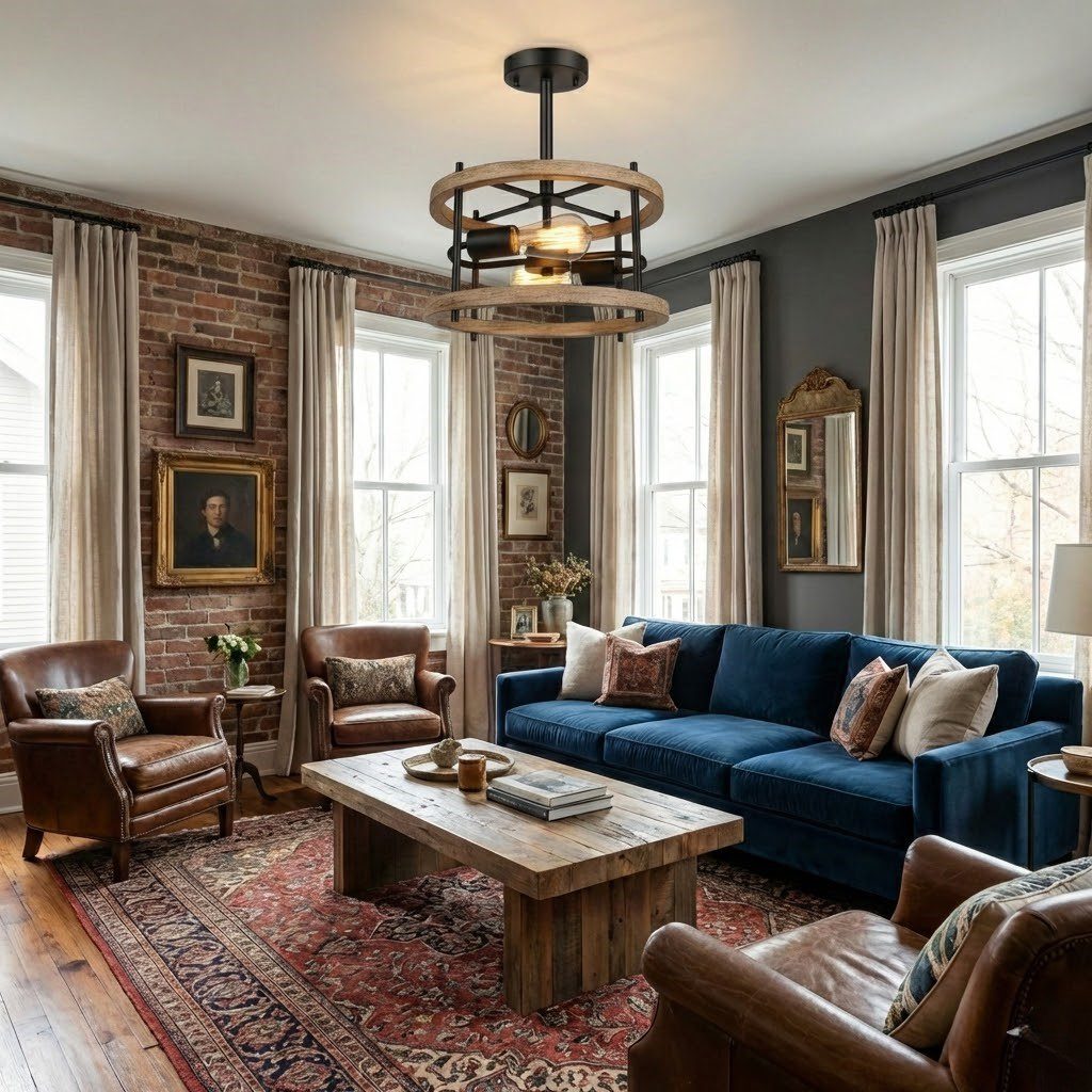 Ce plafonnier industriel marie avec brio la robustesse du métal noir et la douceur naturelle du bois, créant une pièce maîtresse authentique pour votre intérieur. Sa structure circulaire en fer forgé, rehaussée de doubles anneaux en bois aux teintes chaleureuses, évoque l’esprit des ateliers d’antan tout en apportant une touche contemporaine. Les deux ampoules apparentes, mises en scène au cœur de cette architecture épurée, diffusent une lumière intime et accueillante. Idéal au-dessus d’une table à manger ou dans un salon, ce luminaire transforme chaque espace en un lieu de vie empreint de caractère. Sa compatibilité LED vous assure une consommation maîtrisée. Facile à installer, ce plafonnier devient instantanément le point focal de votre décoration, alliant esthétisme brut et élégance rustique.