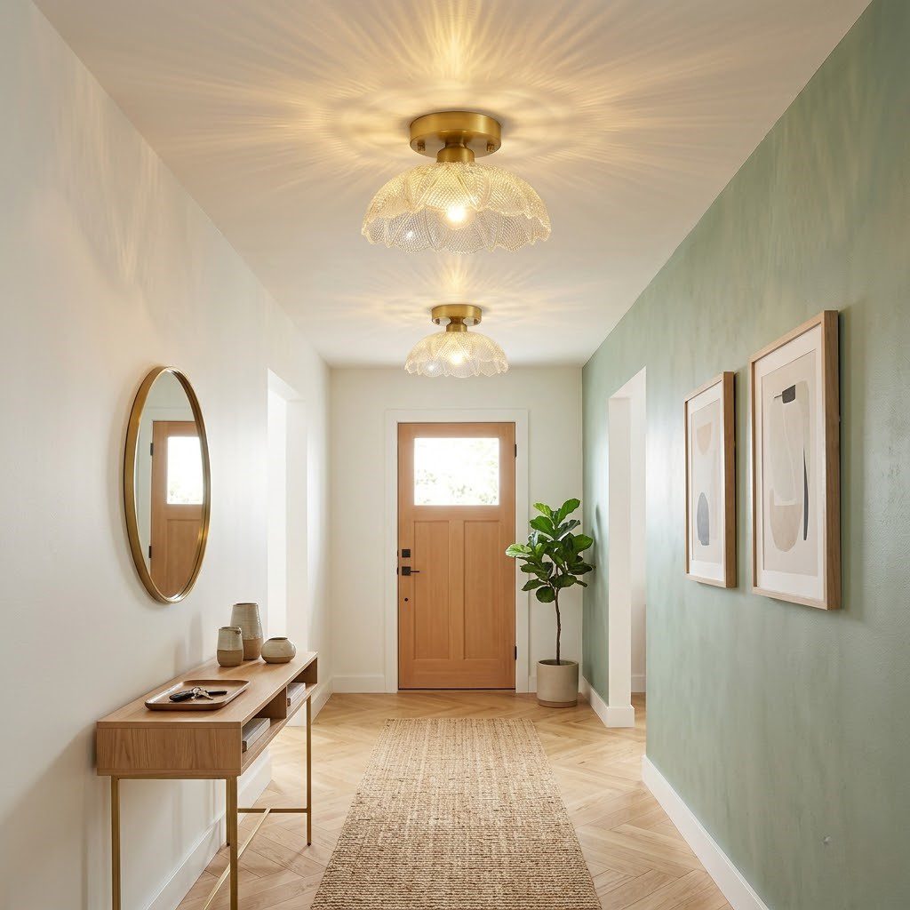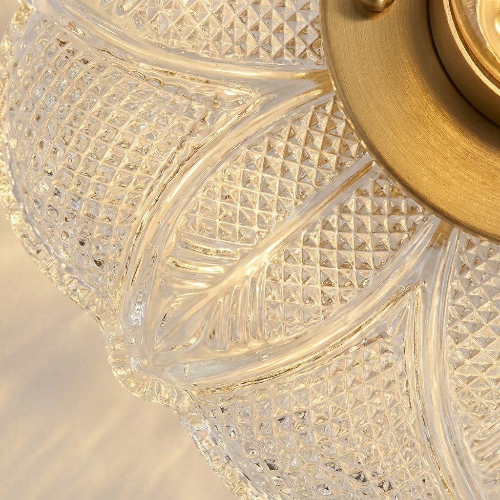 Tel un pétale de fleur figé dans le verre, ce plafonnier laiton diffuse une lumière qui se fragmente en mille arabesques sur votre plafond. L’alliance du laiton brossé doré et du verre taillé finement travaillé évoque une élégance intemporelle, aussi à l’aise dans un intérieur scandinave épuré que dans une ambiance wabi-sabi chaleureuse. Avec seulement 4W en LED, il habille généreusement votre entrée, couloir ou chambre sans alourdir votre facture énergétique. Compact, facile à installer et immédiatement saisissant, il transforme le moindre espace en un lieu où il fait bon vivre.