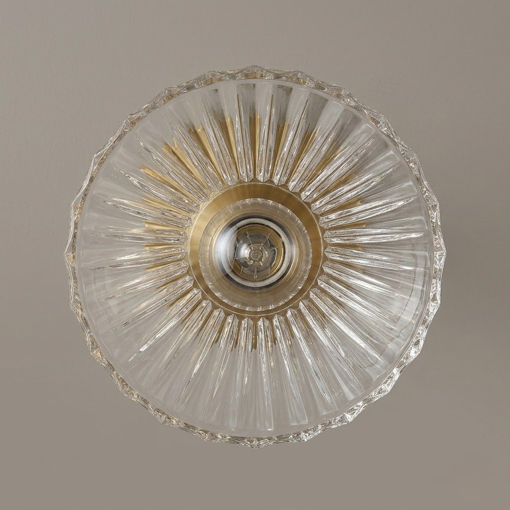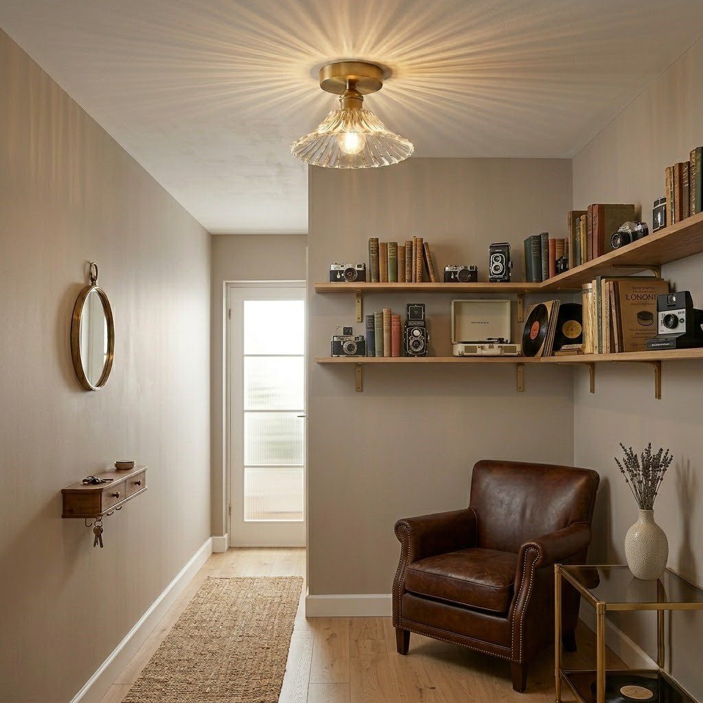 Son verre strié évasé capte la lumière et la projette en éventail sur le plafond: un effet lumineux aussi décoratif qu’envoûtant. La rosace en laiton doré ancre ce plafonnier dans un registre vintage et raffiné, qui dialogue aussi bien avec un intérieur scandinave épuré qu’une déco bohème plus généreuse. Compact et discret, il trouve naturellement sa place dans une entrée, une cuisine ou au-dessus d’un bar. Compatible LED, il s’installe en quelques minutes pour un résultat immédiatement saisissant.