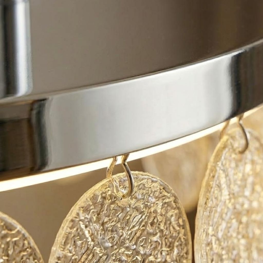 Une couronne de disques en verre texturé, suspendus sur une structure chromée brillante : ce plafonnier impose une présence lumineuse et sophistiquée dès le premier regard. Allumé, chaque pastille de verre capte et diffuse la lumière en créant un halo doux et enveloppant, digne des plus beaux intérieurs contemporains. Sa température de couleur réglable s’adapte à chaque moment de la journée, de la lumière chaude et intimiste du soir à la clarté neutre idéale pour travailler. LED intégrées, installation standard et structure anticorrosion pour un luminaire aussi durable qu’éblouissant.