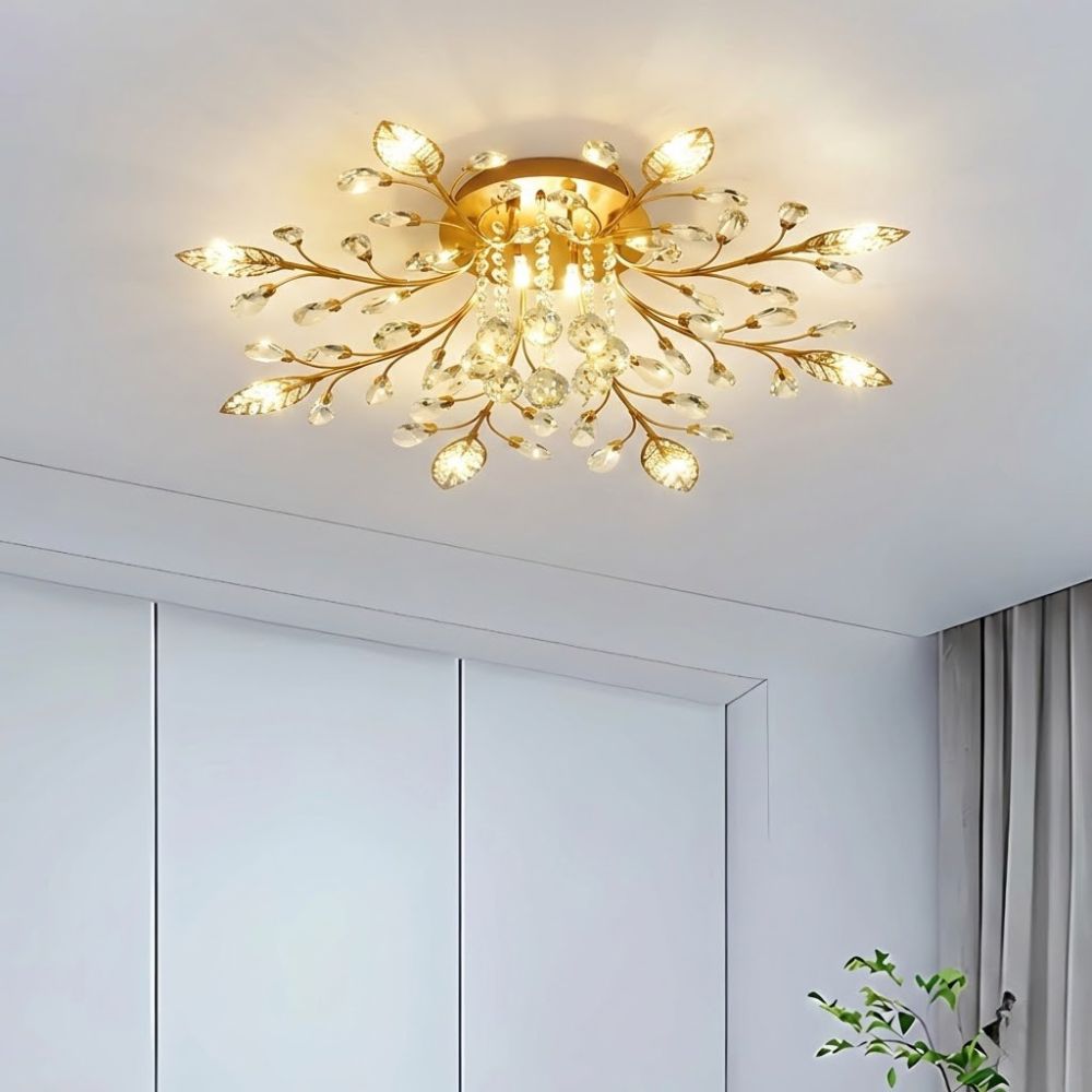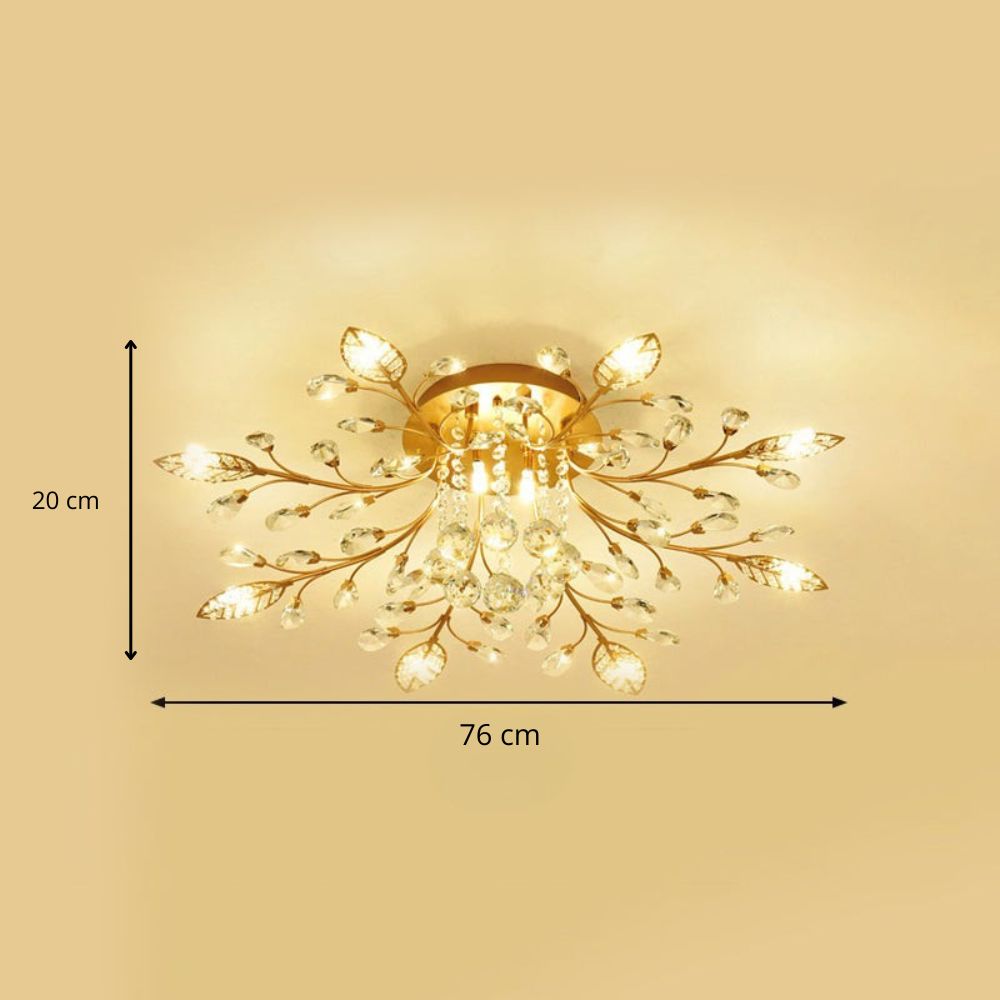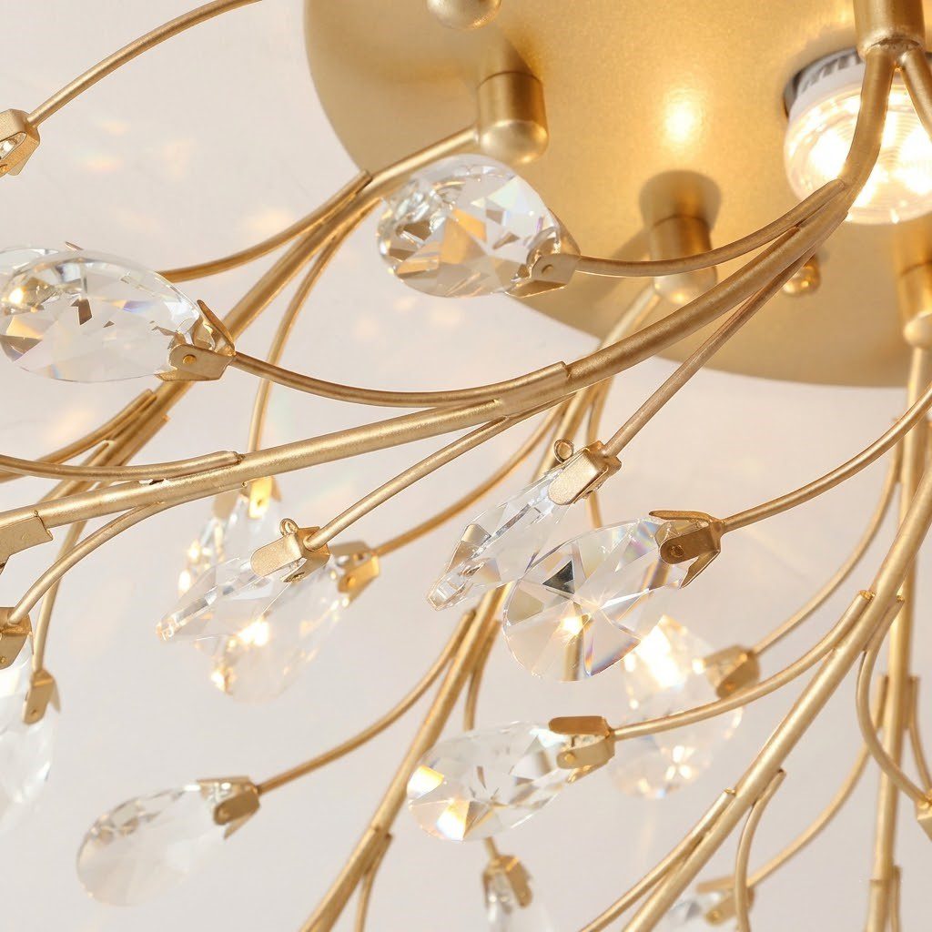 Ce plafonnier salon fleur déploie une floraison précieuse de branches dorées parsemées de cristaux étincelants. Tel un bouquet de lumière figé dans le temps, ses points lumineux irradient à travers des pétales délicats et des perles de cristal, créant un spectacle visuel enchanteur. Chaque branche dessine une arabesque raffinée qui capte et multiplie la lumière en reflets chatoyants. Dans un salon élégant, une salle à manger sophistiquée ou un hall d’entrée majestueux, ce luminaire impose une présence luxueuse sans alourdir l’espace. Sa finition dorée évoque l’esprit Art déco français dans sa version la plus contemporaine, mariant l’héritage classique à la modernité des LED intégrées. Les cristaux suspendus dansent au moindre mouvement d’air, animant subtilement votre plafond. Ce plafonnier transforme l’éclairage fonctionnel en véritable bijou architectural. Installation simplifiée en fixation directe pour profiter rapidement de cette floraison lumineuse qui magnifiera vos moments de vie quotidiens avec raffinement.