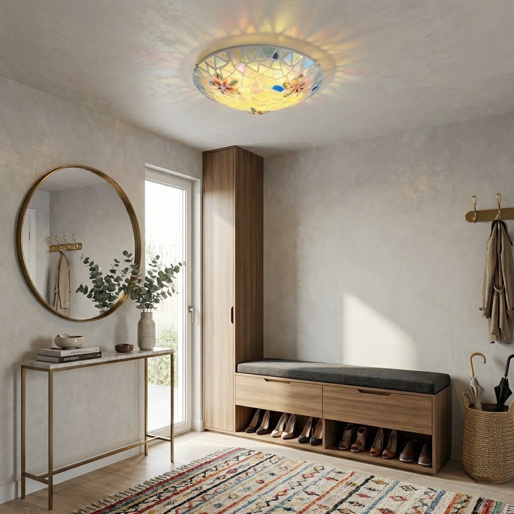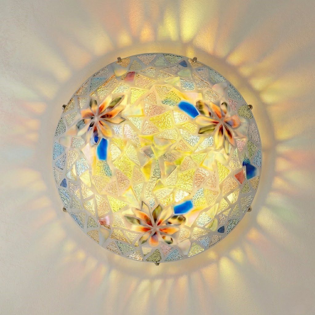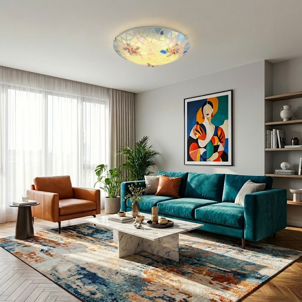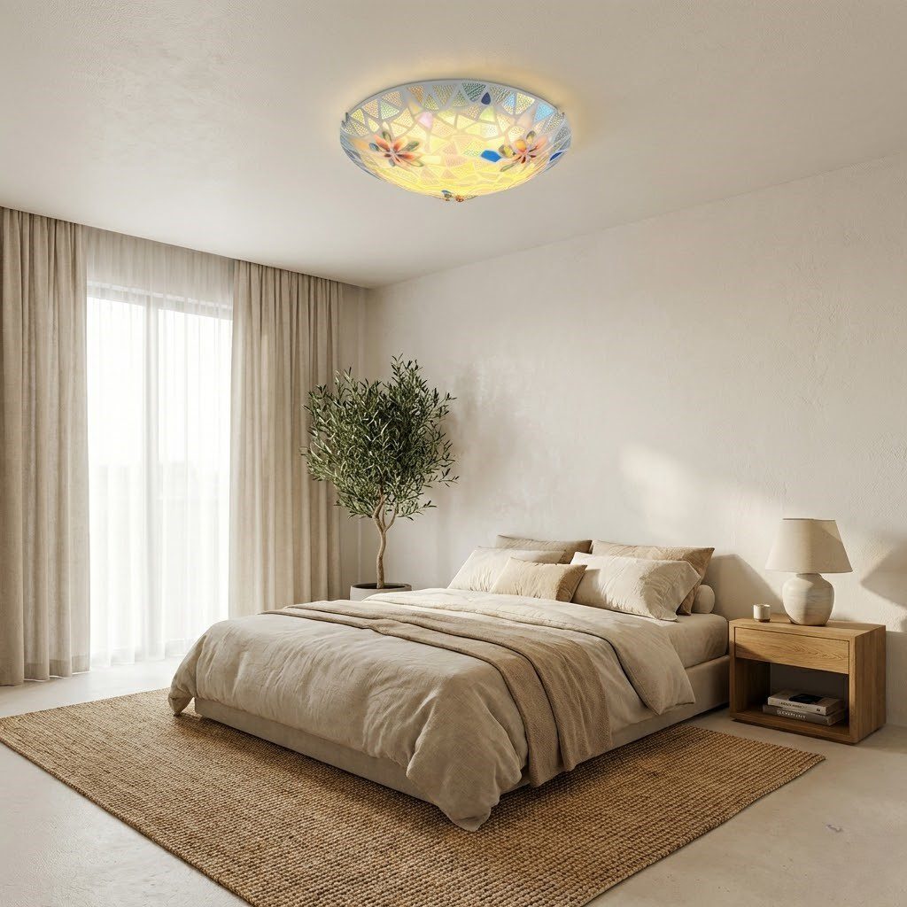 Véritable œuvre d’art suspendue, ce plafonnier en verre mosaïque aux reflets irisés bleus, verts et dorés évoque la délicatesse d’un vitrail d’époque. Allumé, il transforme le plafond en tableau lumineux, diffusant une lumière douce et colorée qui habille la pièce d’une atmosphère unique et chaleureuse. Ses motifs floraux peints à la main ajoutent une touche artisanale et précieuse, loin des luminaires standardisés. Avec seulement 10 cm de hauteur, il s’adapte à tous les plafonds. Avec son éclairage LED, ce plafonnier est économique et ne nécessite aucune ampoule à changer dans le temps. Un luminaire qui allie charme rétro et modernité du quotidien.